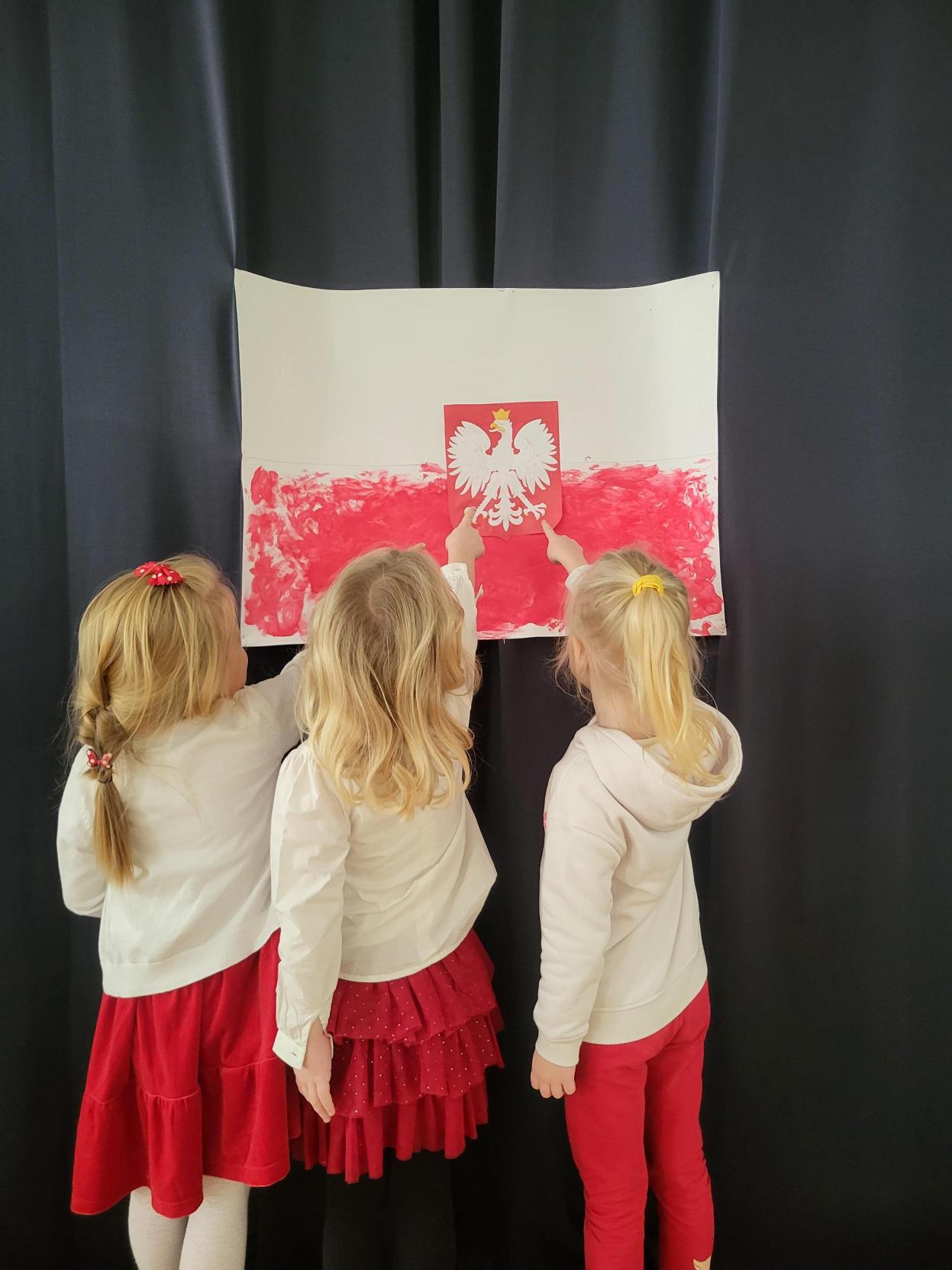 Zdjęcie przedstawia trzy dziewczynki ubrane w biało-czerwone stroje stoją przed pracą plastyczną przedstawiającą flagę Polski z godłem i wskazują na biało-czerwony orzeł w centralnej części.