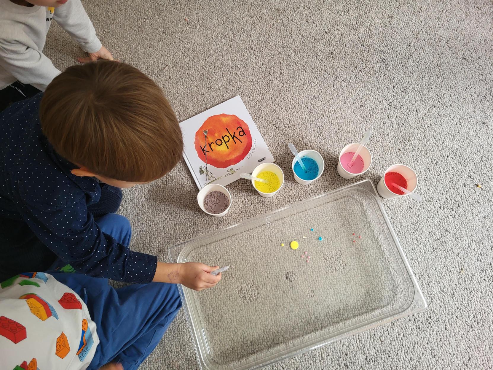 Zdjęcie przedstawia chłopca używającego pipety do zrobienia kolorowej kropki w pojemniku pełnym wody. Wokół pojemnika stoją kubeczki z kolorowym płynem oraz leży książka pt. "Kropka"