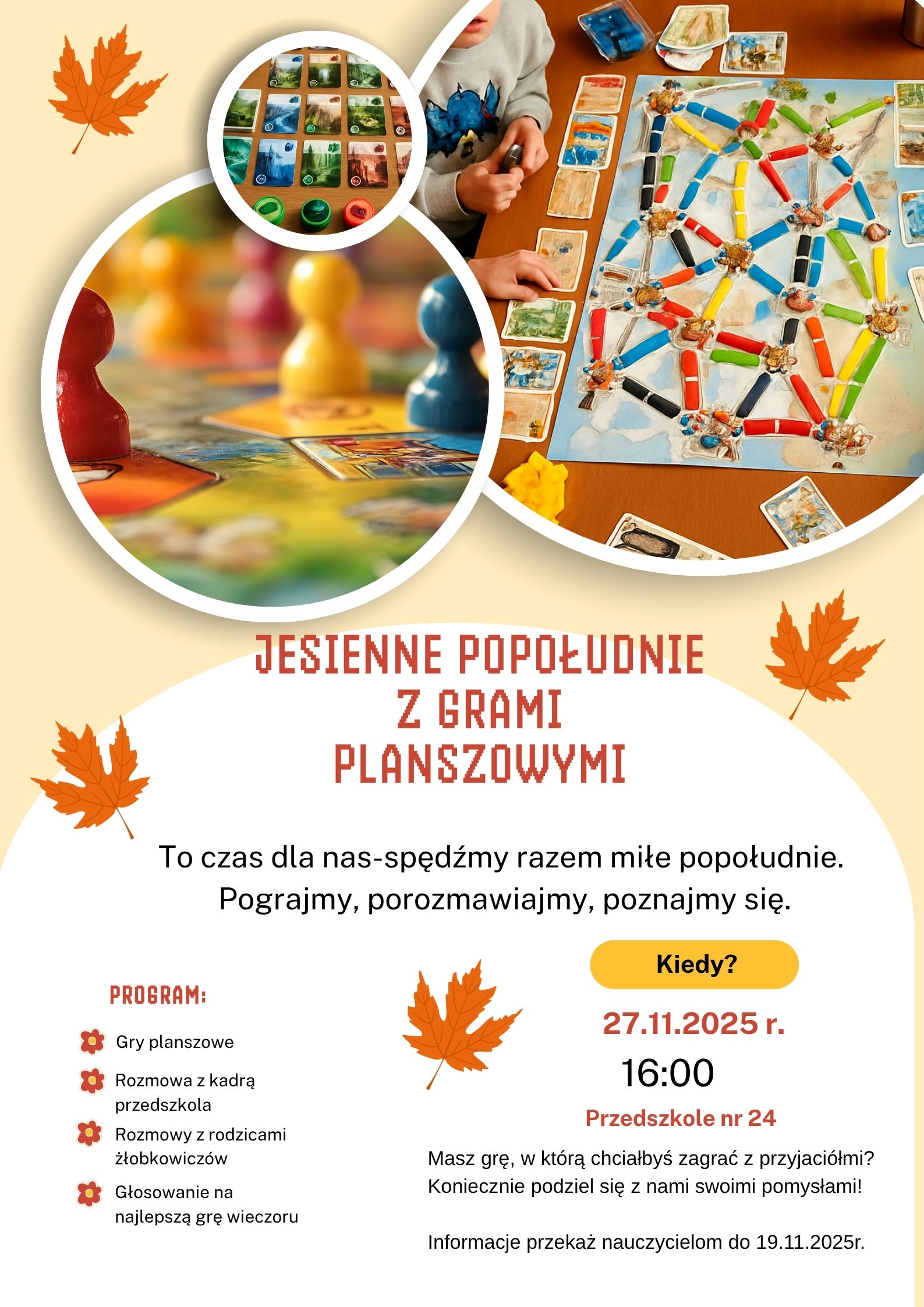Plakat zapraszający na jesienne popołudnie z grami planszowymi, z kolorowymi zdjęciami planszówek, informacją o programie spotkania, dacie 27.11.2025, godzinie 16:00 i miejscu – Przedszkole 24.
